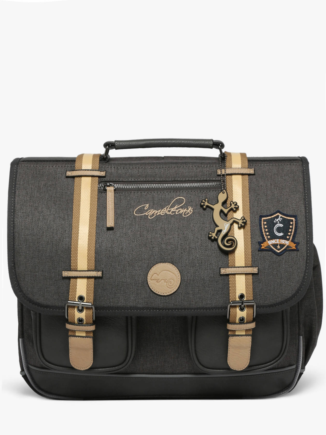 Deze schooltas uit de Vintage collectie van het merk Caméléon heeft een breedte van 41 cm. Ideaal voor vanaf het 4de leerjaar! Dit model heeft een duidelijke vintage look, dankzij twee voorvakjes en de riempjes met gespen. De schooltas beschikt over drie ruime compartimenten, die schriften (24x32 cm), mappen en schoolboeken van A4 formaat kunnen bevatten. Onder de overslagflap bevindt zich ook een uniek opbergvakje, voorzien van een gratis liniaal. De twee kleine ritsvakjes vooraan zijn perfect om een snack of andere kleine spulletjes in te stoppen. Dit model beschikt ook over een naamlabel aan de achterzijde, en kan makkelijk gesloten worden dankzij een dubbel kliksysteem. Voor optimaal comfort zijn de rugzijde en schouderbanden extra gewatteerd. Dankzij enkele reflectoren kan uw kind zich ook veilig in het verkeer begeven. Vintage op z'n mooist!