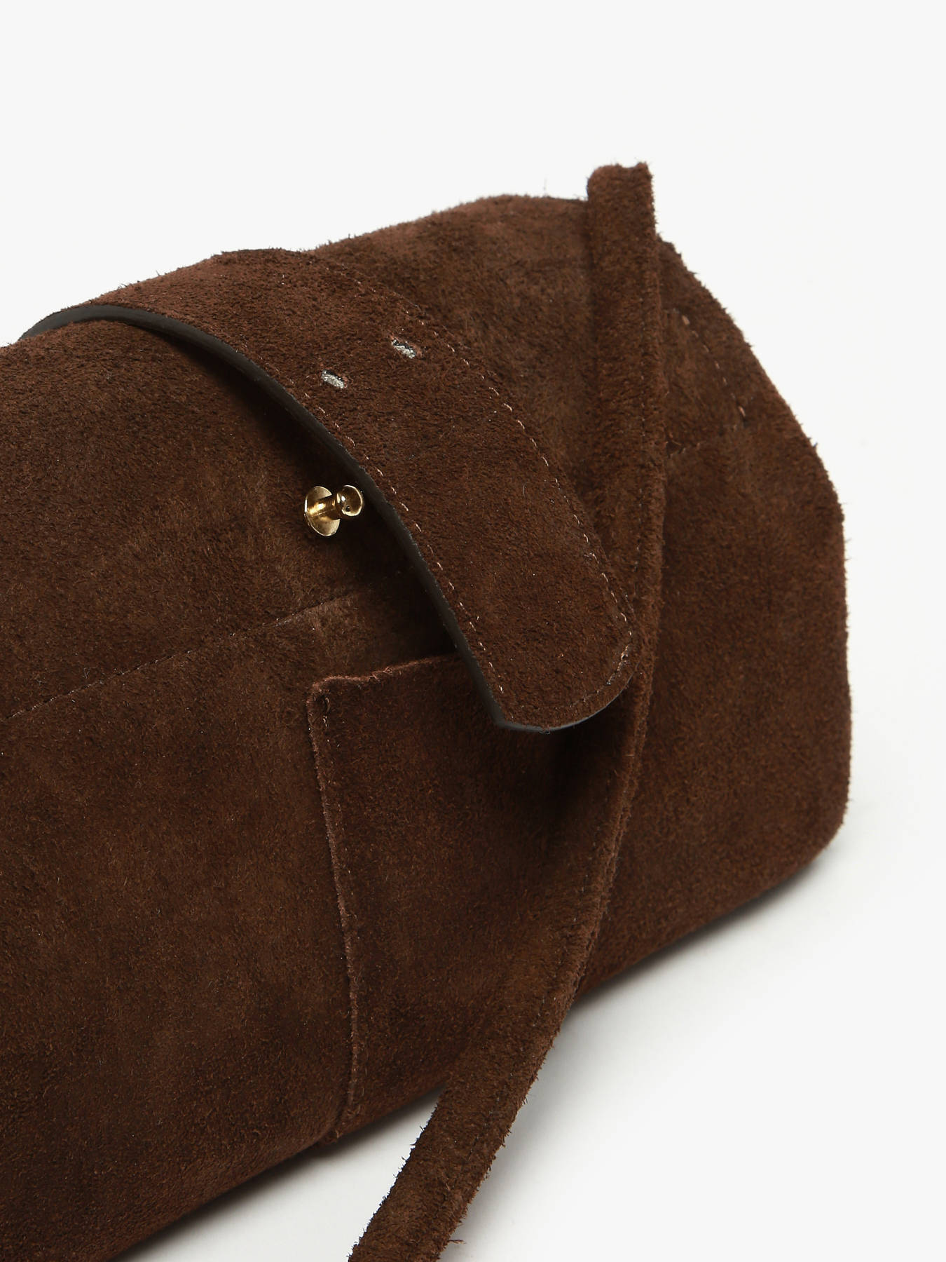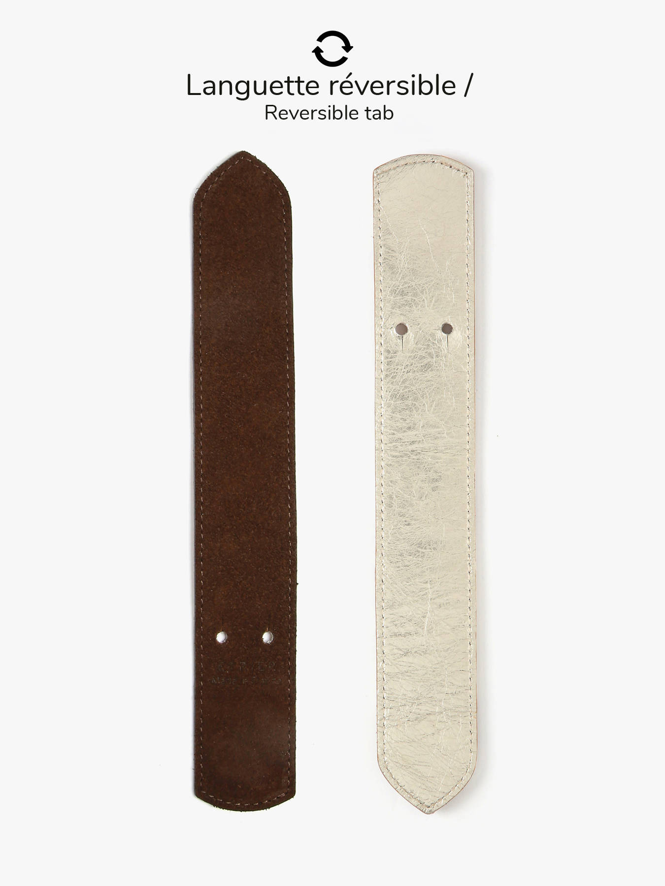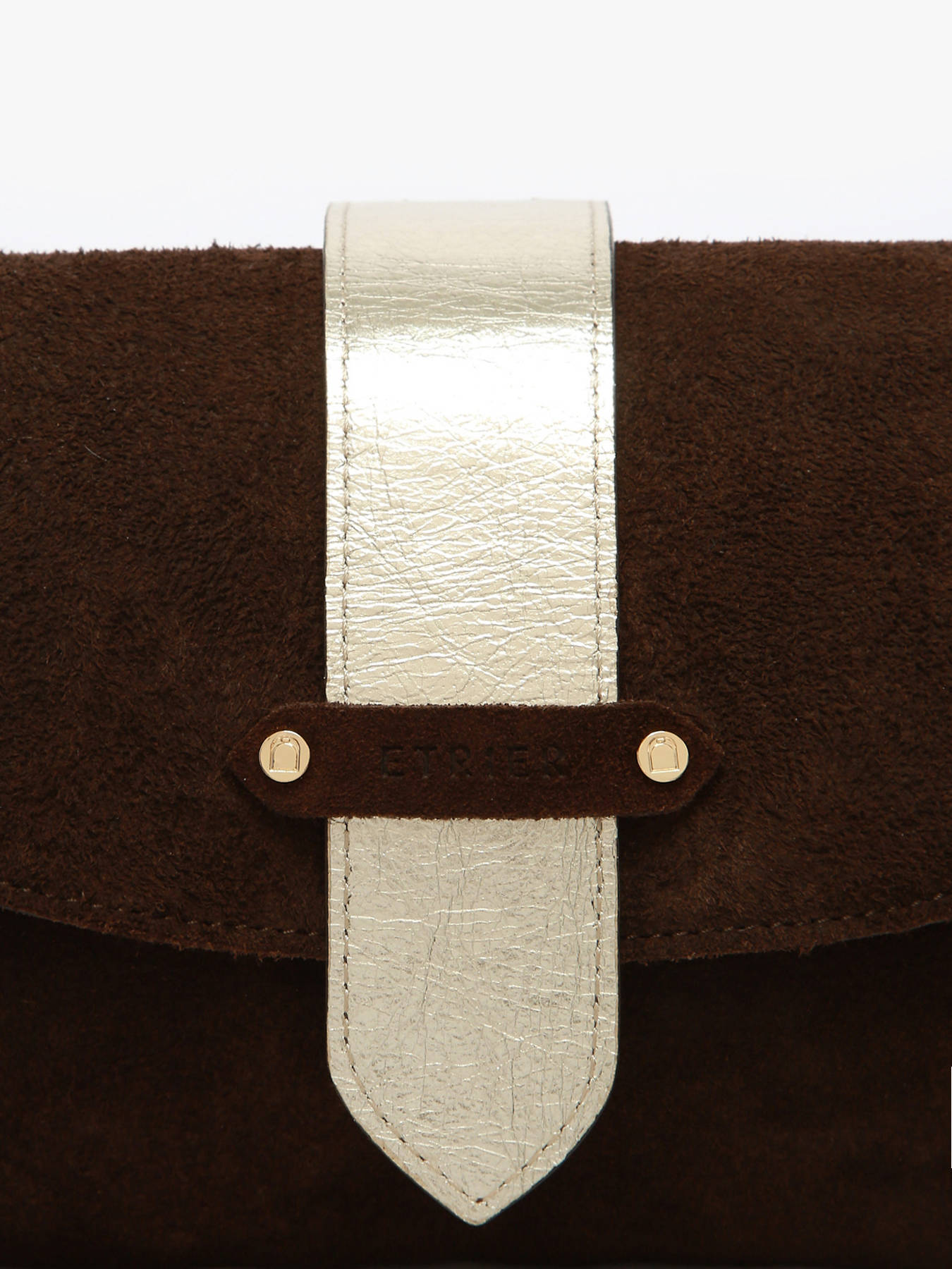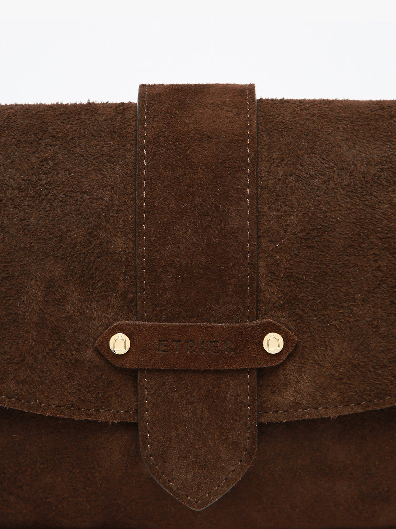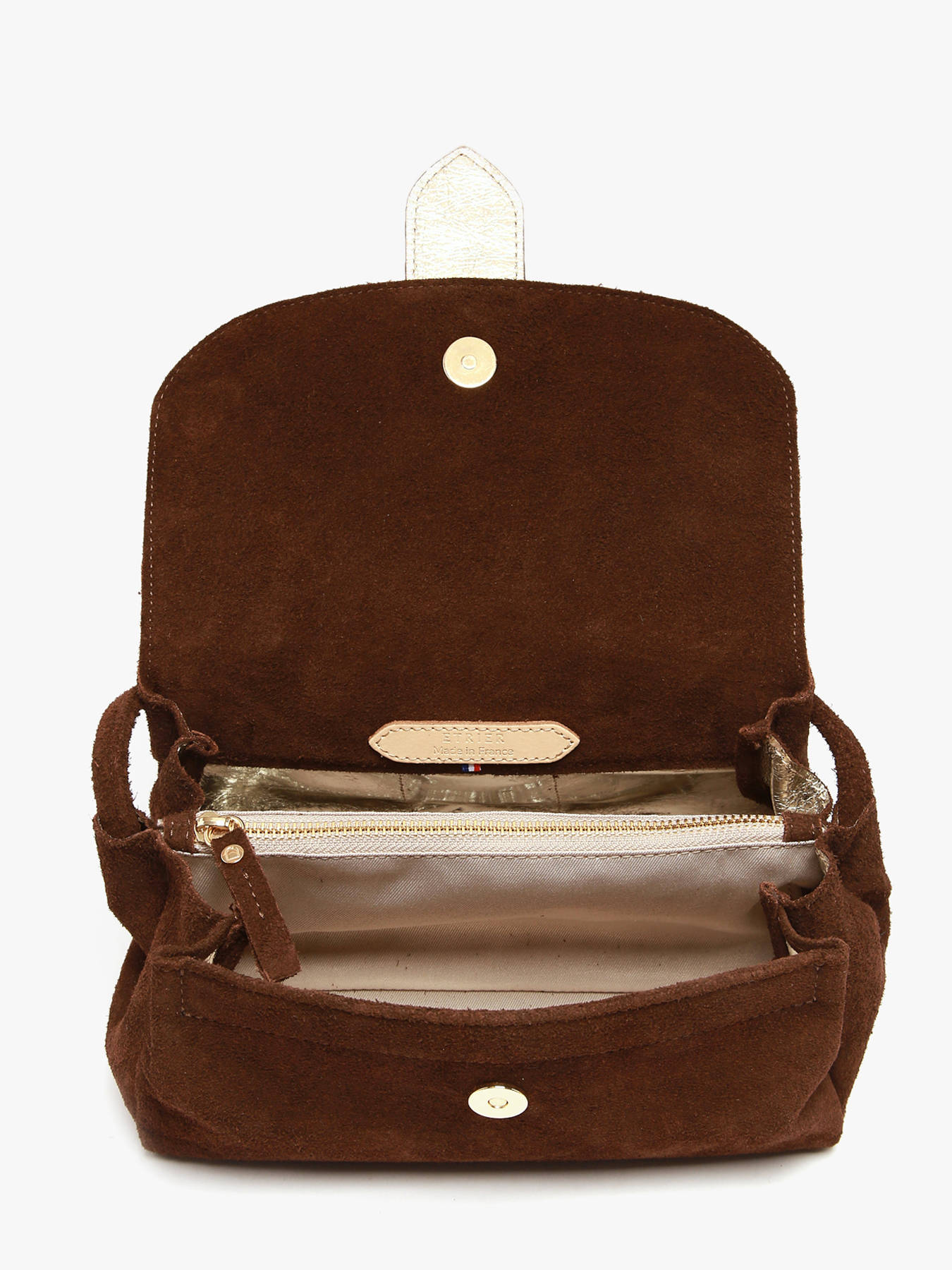 De AGNES-tas van ETRIER in maat M is vervaardigd uit Italiaans rundsleer met suède finish en sluit met een flap voorzien van een drukknoop. De stevige bodem zorgt voor een optimale vormvastheid. De omkeerbare riempje, met een goudkleurige zijde en een zijde in bijpassend leer, wordt bevestigd met twee kraagknopen en schuift in een speciaal ontworpen achtervak. De met goudkleurig leer gevoerde binnenkant omvat drie compartimenten, waaronder een centraal ritsvak, zodat u uw persoonlijke spullen gemakkelijk kunt ordenen. Het ETRIER-logo, uitgevoerd in natuurlijk leer, is voorzien van een klein Frans vlaggetje dat een elegante en onderscheidende vleugje toevoegt. De schouderriem, ingesteld op 65 cm bij levering, kan eenvoudig in hoogte worden aangepast dankzij een discrete knoop aan de binnenkant van de tas. U hoeft enkel aan het geknoopte deel te trekken, de knoop los te maken, de lengte aan te passen en vervolgens opnieuw een knoop te leggen. Dit ingenieuze systeem combineert elegantie en functionaliteit. Gemaakt in Frankrijk.