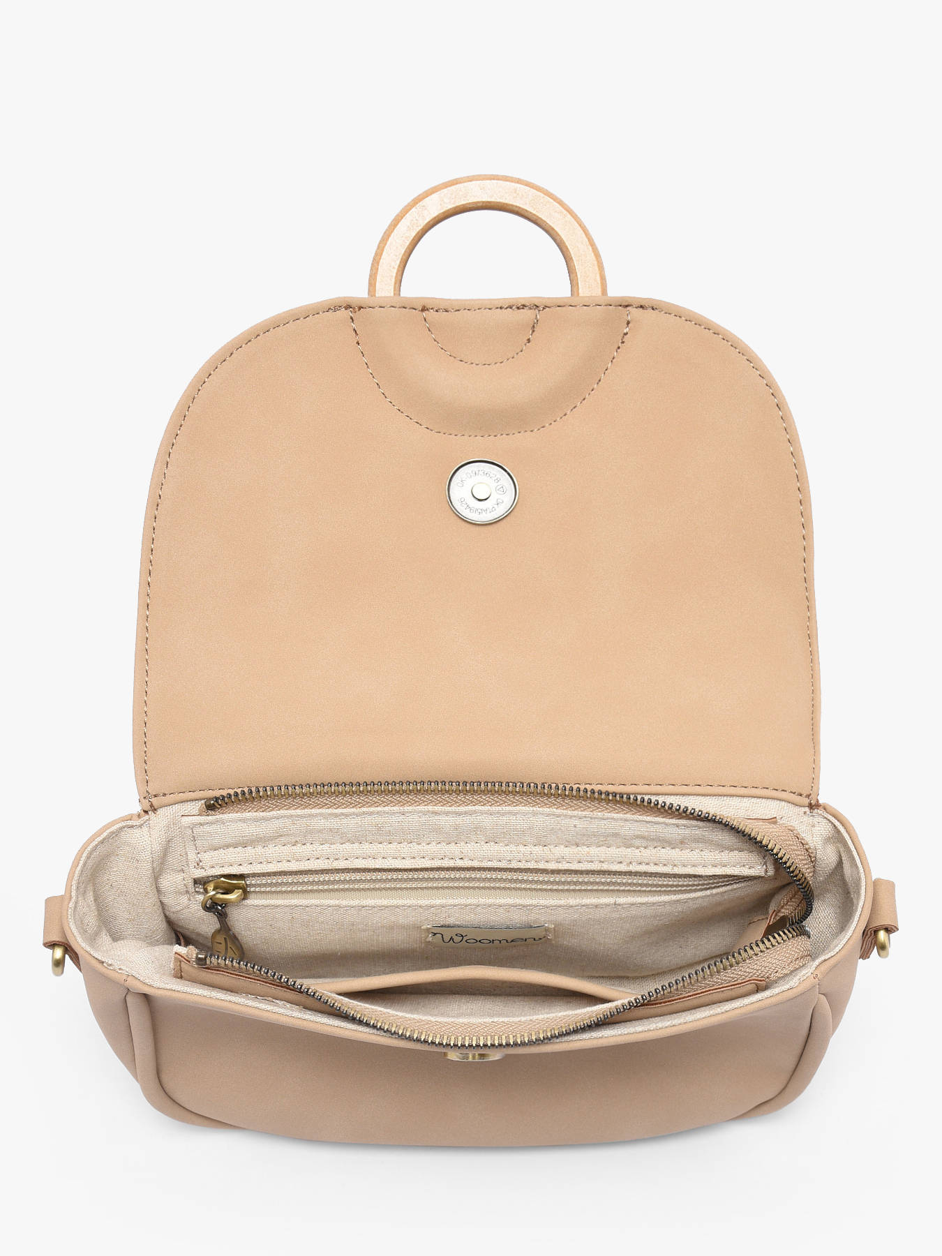 De WOOMEN cross body tas uit de CROCUS-lijn, gemaakt van gerecycled polyurethaan met een voering van katoen en linnen, sluit met een rits, een flap en een magneet. De tas wordt hoog over de schouder gedragen en heeft een zak aan de achterkant, een eenvoudige zak en een ritsvakje aan de binnenkant. De beige schouderriem met het Woomen-print en de houten ring op de flap voegen een elegante toets toe.