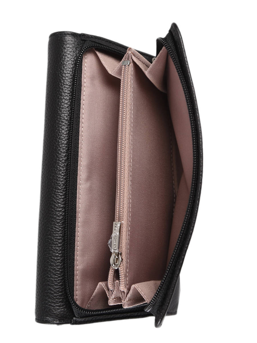 Tweedelige portefeuille uit de Foulonné Pia collectie van Lancaster.Deze portefeuille is gemaakt van een kwaliteitsvol rundsleer met een gekorrelde structuur. Het vorenste deel sluit met een overslagflapje en een drukknop en beschikt over 16 kaartgleuven, twee open steekvakjes en een vak voor biljetten. Het deel met rits achteraan beschikt over twee vakken, gescheiden door een middenvak met rits.