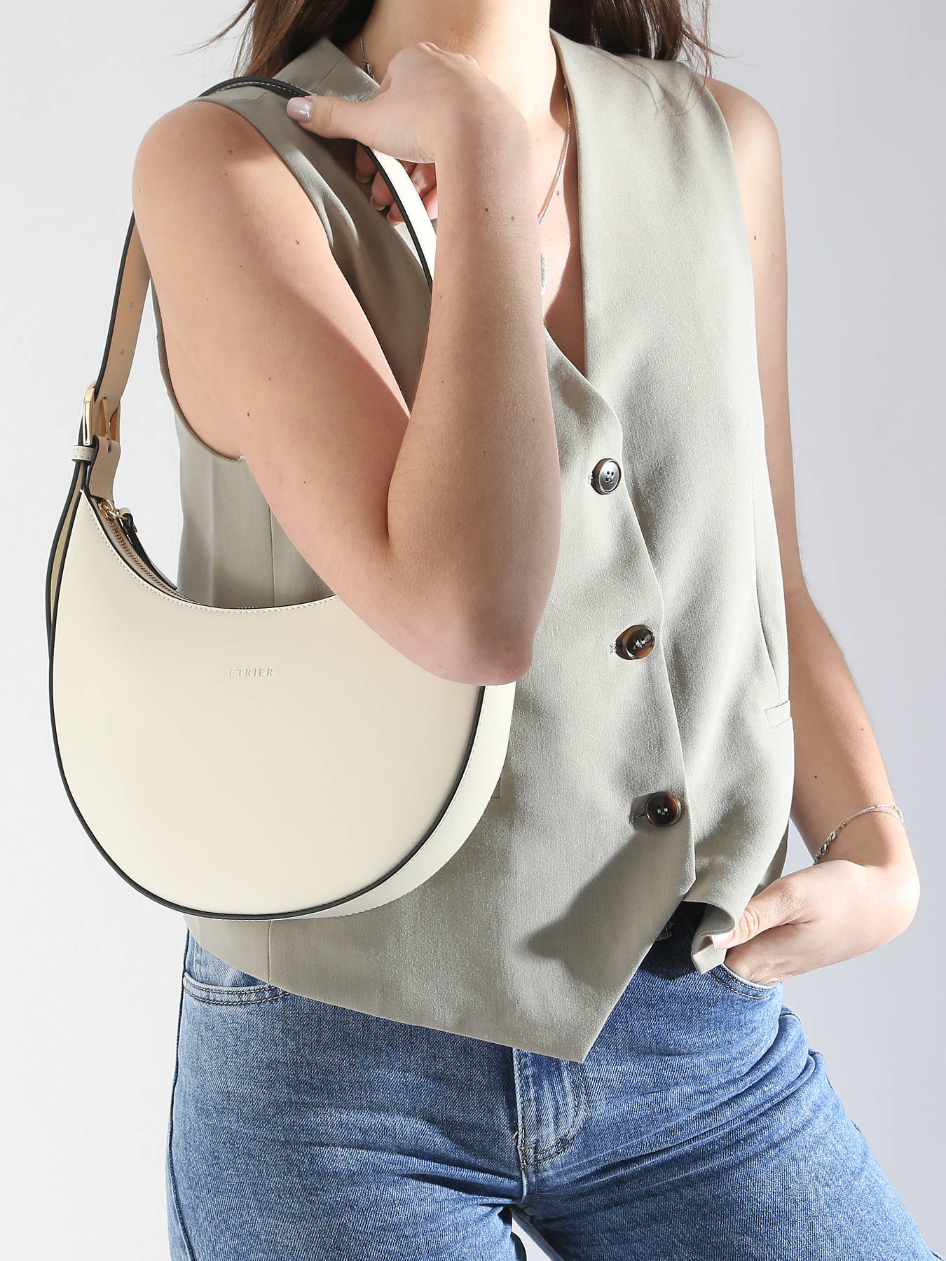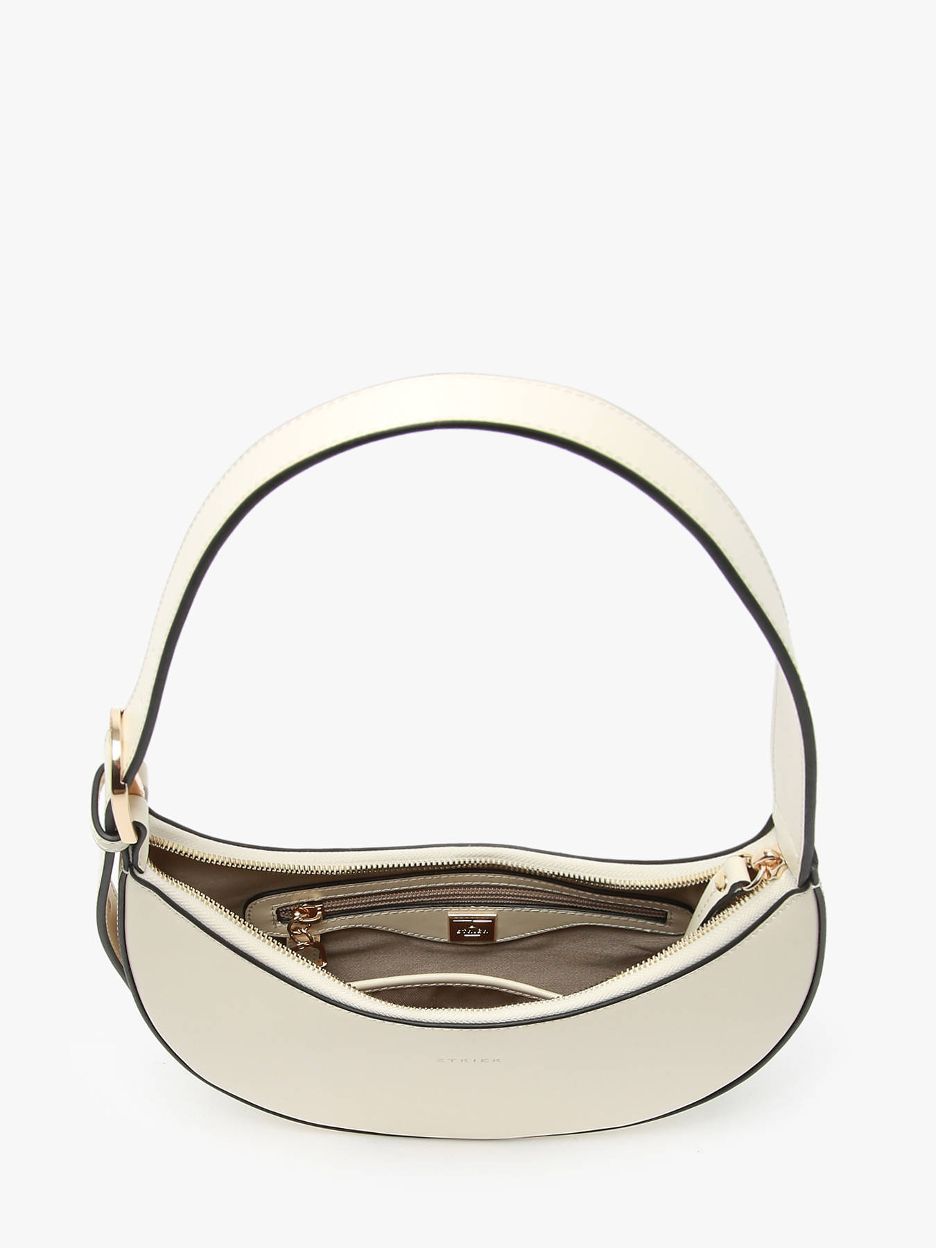 Deze halve maan tas ETRIER uit de ALTAIR-lijn, gemaakt van rundleer, combineert elegantie en functionaliteit. De schouderriem wordt verfraaid door een verfijnde gesp en een klein druppelvormig handtekening. Functioneel, beschikt het over een ruime compartiment, een eenvoudig vak en een ritsvak. De tas sluit met een rits. Hoogte van de handgreep: 26 cm.